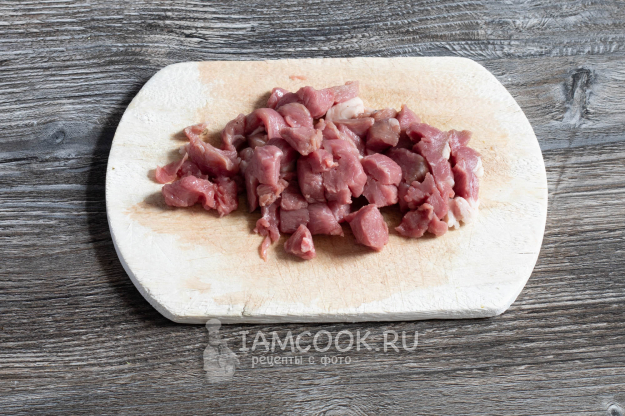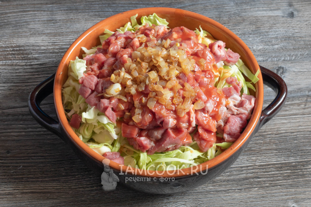 Смешиваем в жаропрочной ёмкости капусту, лук, баранину и томатный сок. Пока не солим.