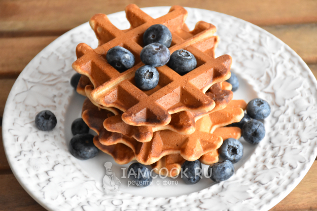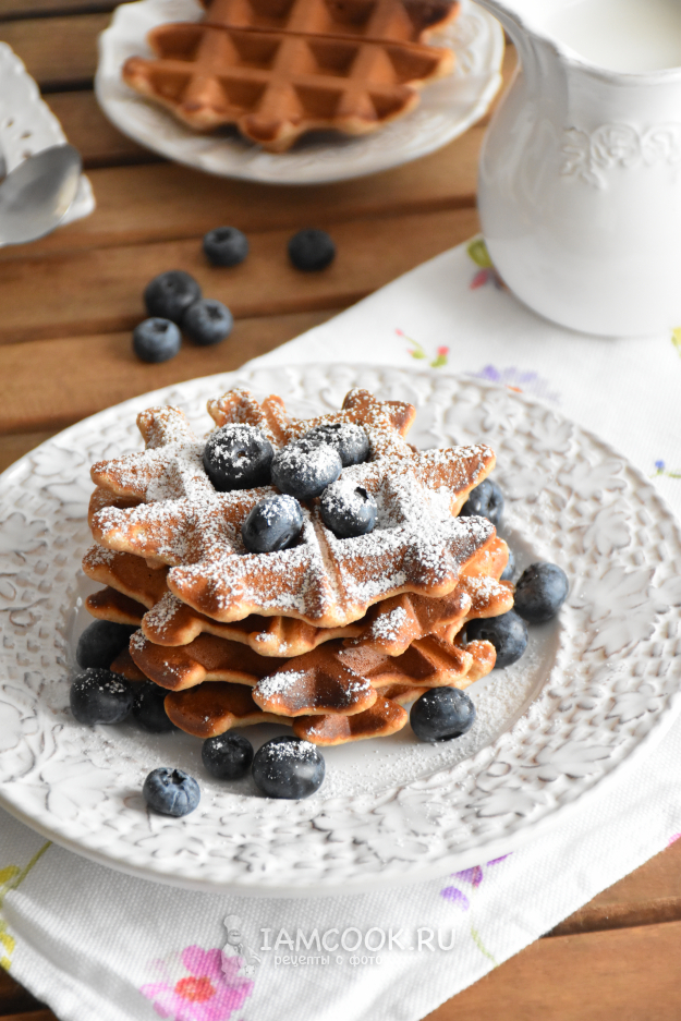 Разогреть вафельницу и выпекать вафли согласно инструкции. Бельгийские вафли без яиц готовы. Приятного аппетита!