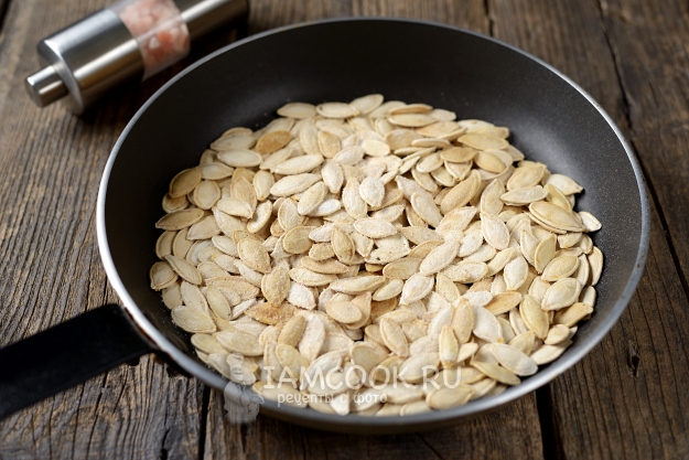 Очищенные семена также положите в горячую сковороду, сушите сначала на среднем огне минуты 3-4, дальше сделайте огонь тихим и сушите до полной готовности еще минуты 2-3. Семечки нужно помешивать настолько часто, насколько сможете. Когда они будут желаемой степени прожарки, всыпьте любимую приправу и немного соли, перемешайте, снимите с огня.