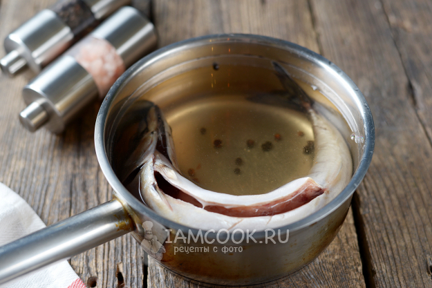 Если будете солить рыбу часто, заведите себе старенький сотейник, его не жалко. Вскипятите воду, всыпьте соль, сахар, перец горошком и пару мелких лавровых листов. Растворите кристаллы полностью, остудите маринад.