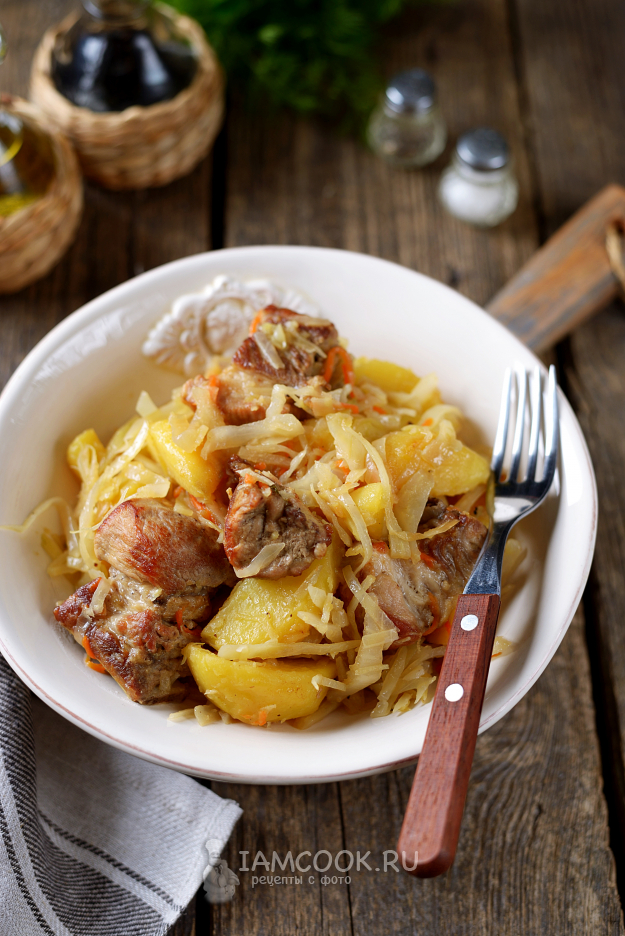Тушеная картошка с капустой и свиными ребрышками готова. Вкусно, сытно и очень калорийно.