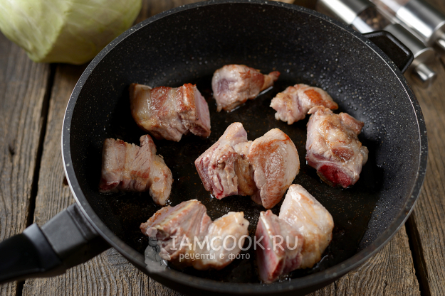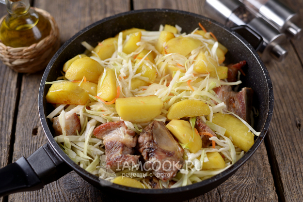 Нашинкуйте тоненько капусту, всыпьте в сковороду, тушите овощи с ребрами на тихом огне под крышкой еще минут 5-7. В это время нужно будет подливать воду, чтобы овощи не пригорали. Блюдо получается немного сладковатым за счет лука, моркови и капусты, при желании можно добавить немного белого винного уксуса для кислоты.