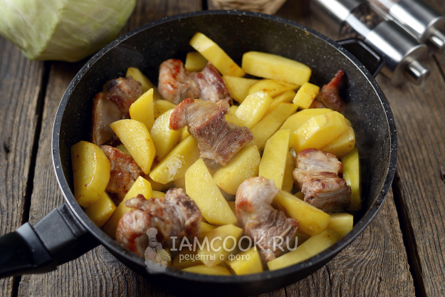 Картофель нарежьте достаточно крупными ломтиками, всыпьте в сковороду, обжаривайте вместе с ребрами минут 15.