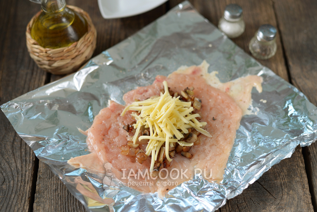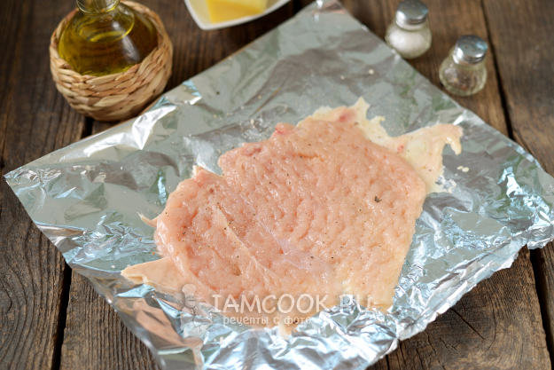 Куриную грудку помойте, обсушите, снимите аккуратно кожу, разрежьте ее вдоль пополам. Выложите кусок кожи внутренней стороной вверх на глянцевую сторону фольги. Чуть посолите и поперчите ее.