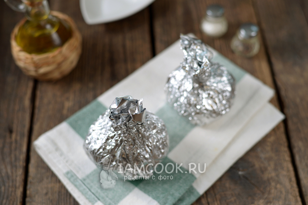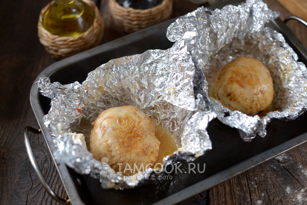 Аккуратно сверните фольгу с курицей в шарик, старайтесь, чтобы края филе и кожи соприкасались. Переложите бомбочки в противень, отправьте в предварительно разогретую до 200 градусов духовку на 25-30 минут.