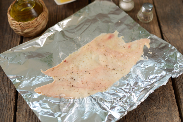 Филе разрежьте вдоль на две части, накройте пищевой пленкой, отбейте тонко кухонным молотком. Выложите филе на кожу, также посолите и поперчите по вкусу.