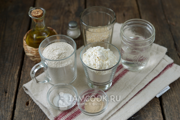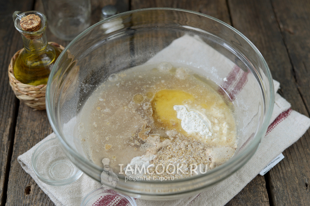 Всыпьте три вида муки, влейте масло, воду, всыпьте дрожжи, щедрую щепоть морской соли и немного сахара.