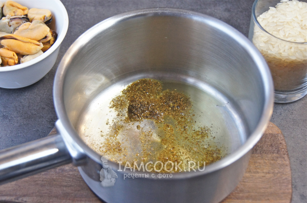 Разогрейте сотейник или сковороду с оливковым маслом, добавьте специи и быстро прогрейте на среднем огне, но не перегрейте, специи могут подгореть.