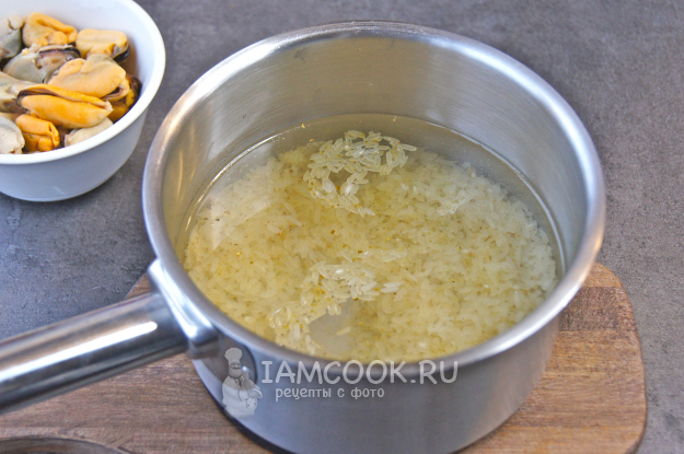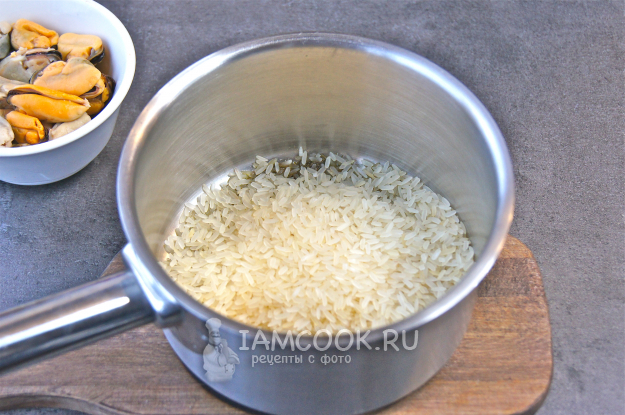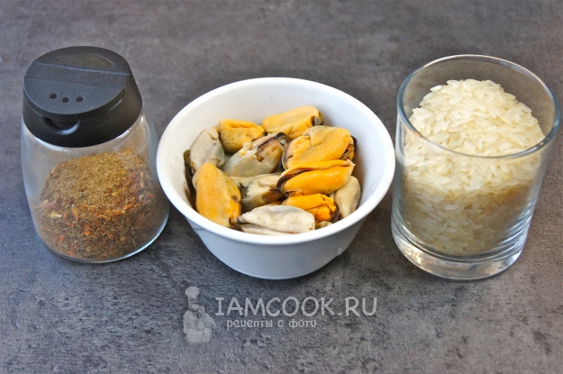 Подготовьте все нужные ингредиенты для приготовления риса с мидиями.