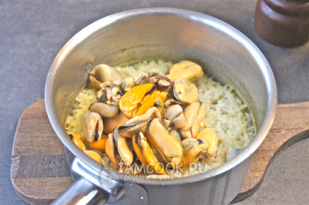 Затем выложите мясо мидий, посолите, перемешайте и готовьте до полного испарения жидкости.