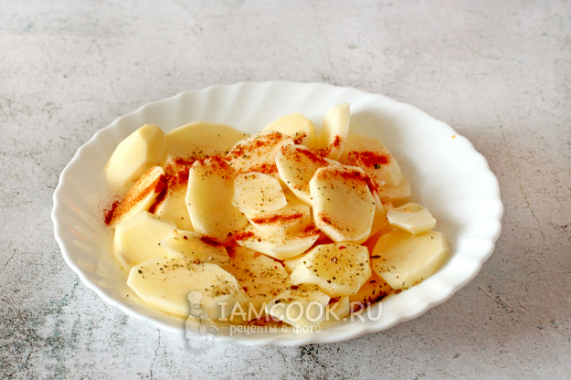 Для этого очистите картофель и нарежьте очень тонкими дольками, так как имеется вероятность того, что картошка не успеет приготовиться в духовке вместе с рыбой. Сорта картофеля бывают разные и время приготовления в духовке тоже разное. Мне повезло - у меня разваристая картошка, сладковатая. Добавьте к долькам картофеля ложку растительного масла, соль и специи. Хорошенько перемешайте.