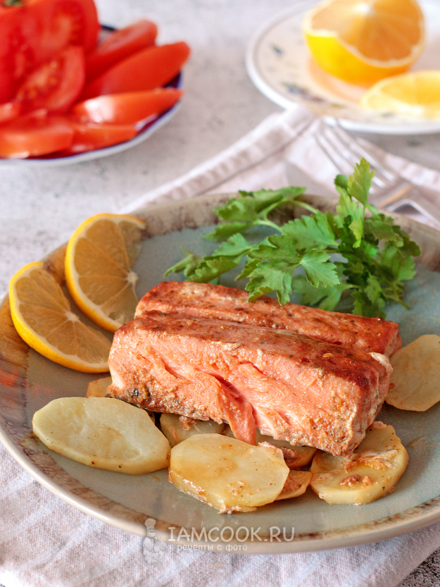 Кижуча можно приготовить в смазанной маслом форме, а можно на подушке из овощей, например, из картофеля.
