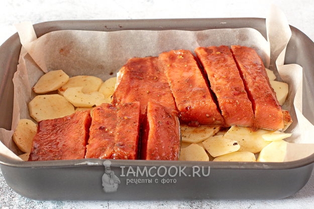 Выложите картофель на противень, выстланный пергаментом или просто смазанный маслом. Поверх картофеля разложите промаринованные кусочки рыбы. Поставьте форму в разогретую до 180 градусов духовку. Сверху накройте фольгой и запекайте.