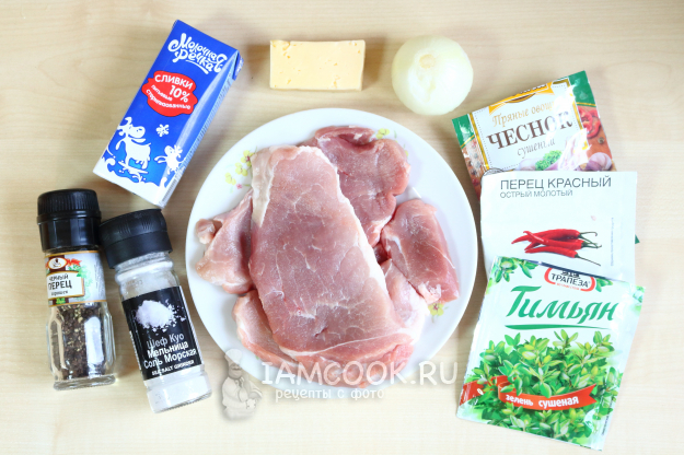 Подготовим продукты для запекания свинины в сливках в духовке и приступим.
