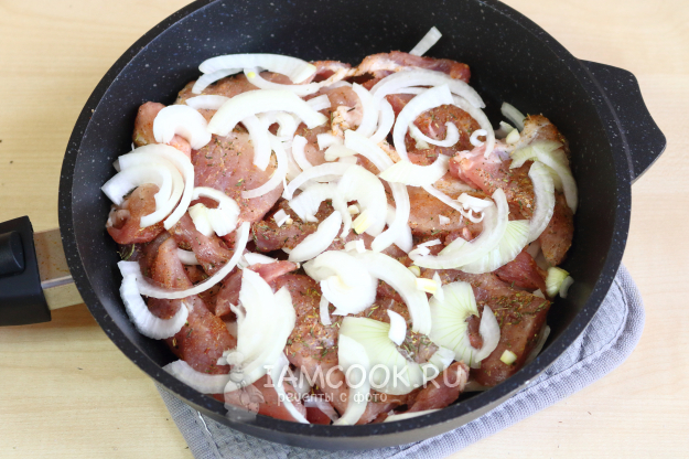 Заранее включим духовку на 180 градусов. Возьмём жаропрочную форму. Я использую сковороду со съёмной ручкой. Слоем выкладываем мясо, сверху кладём половину нарезанного лука, далее снова мясо и лук.