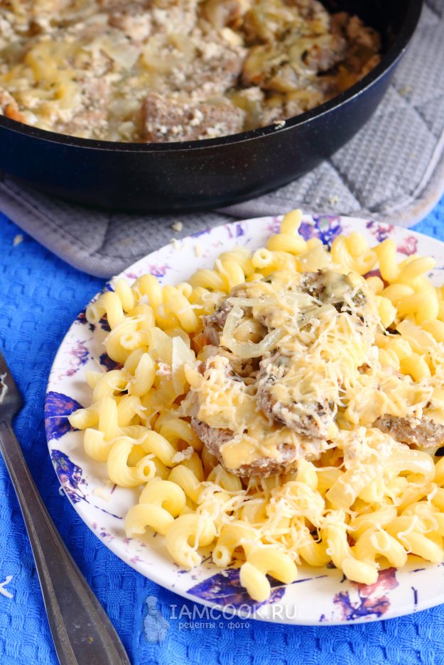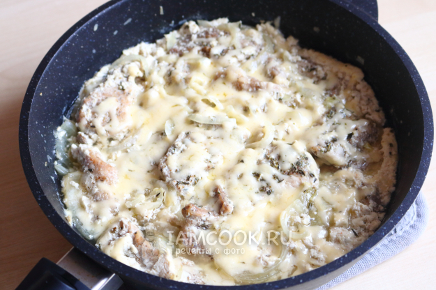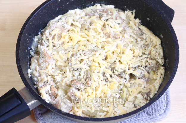 Спустя 35-45 минут достаём сковороду, убираем фольгу и посыпаем свинину сыром.