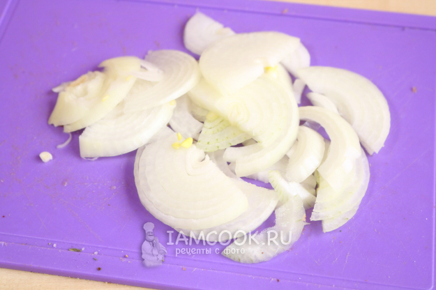Тем временем подготовим всё остальное. Лук очищаем и нарезаем полукольцами.