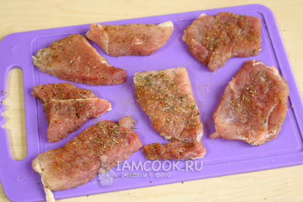 Для приготовления я беру 3 свиных шницеля (400 граммов), которые разрезаю на части меньшего размера – так лично мне удобнее подавать готовое блюдо. Можно использовать шницели целиком.