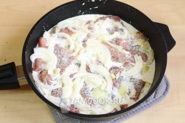 Сливки под рукой наготове. Они у меня комнатной температуры. Вскрываем упаковку и смело заливаем содержимое сковороды жидкостью. Сливки должны почти полностью покрывать мясо. Закрываем всё это чудо фольгой (либо жаропрочной крышкой, если имеется) и ставим в разогретую духовку.