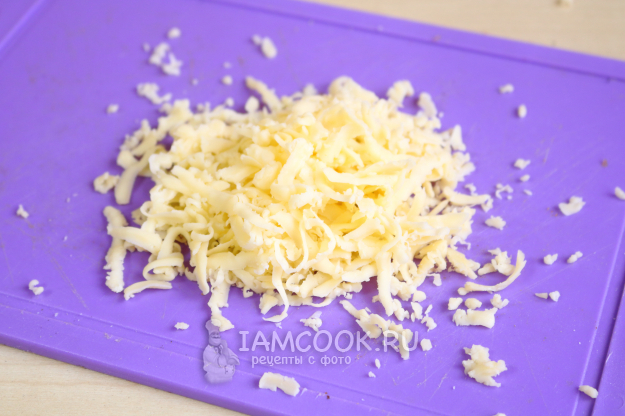 Пока мясо готовится, сыр натираем на тёрке. Натираем побольше, так как с ним намного вкуснее.