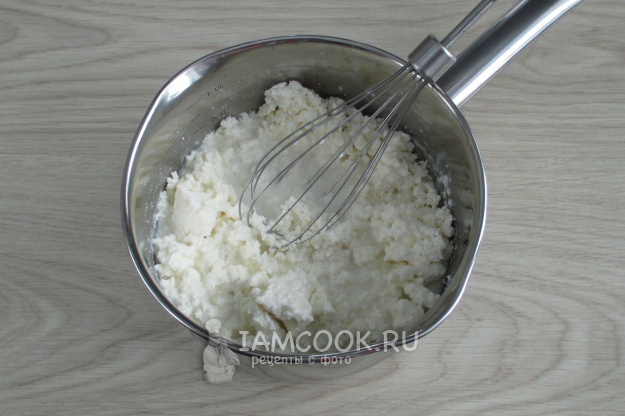 Перетрите творог с сахарной пудрой и ванилином.