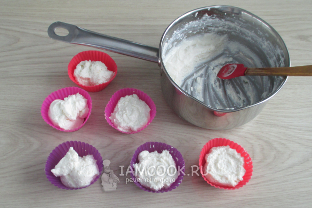 Полученную зефирную массу из творога либо отсадите из кондитерского мешка, придавая форму зефира, либо разложите по формочкам или в одну, например, прямоугольную форму. У меня получилось восемь таких, как на фото, неполных силиконовых формочек для кексов.