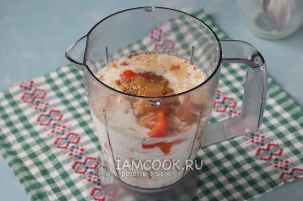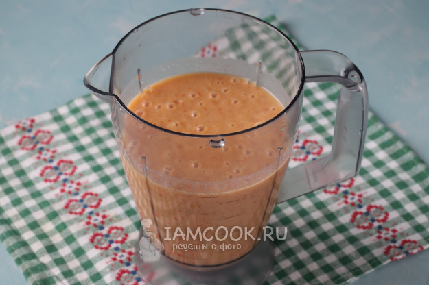 Накрыть чашу крышкой и взбить массу блендером до однородной консистенции.