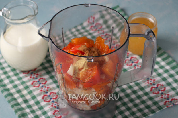 Сложить яблоки и хурму в чашу блендера. Добавить порошок корицы и имбиря.