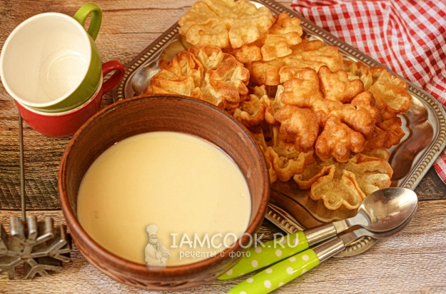 Можно приступать к изготовлению тарталеток. Для этого подсолнечное масло в миске или в глубокой сковороде нагреем, в масле нагреем форму и быстро окунем в тесто. Затем сразу перенесем в разогретое масло. Тарталетка быстро соскочит с формы, и далее мы просто дожариваем ее до готовности. Первая тарталетка, так же, как и первый блин, может получиться «комом», так как масло будет недостаточно разогрето, и форма тоже может быть недостаточно разогретой.