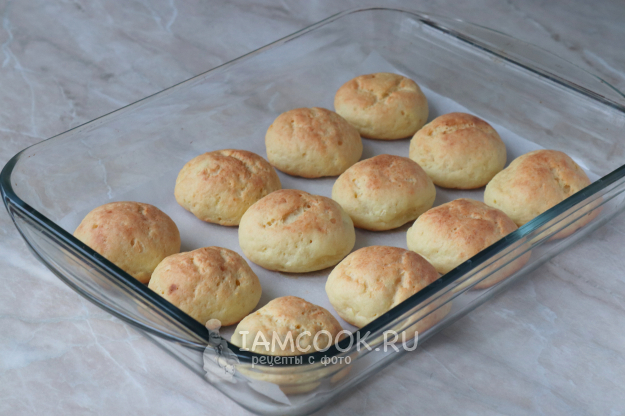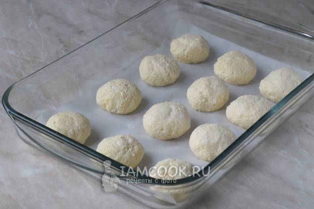 Готовое тесто разделите на 12 равных частей. После чего смочите ладони в холодной воде и сформируйте из теста небольшие шарики. Подготовленные заготовки выложите в жаропрочную форму, застеленную пергаментом, на расстоянии друг от друга.