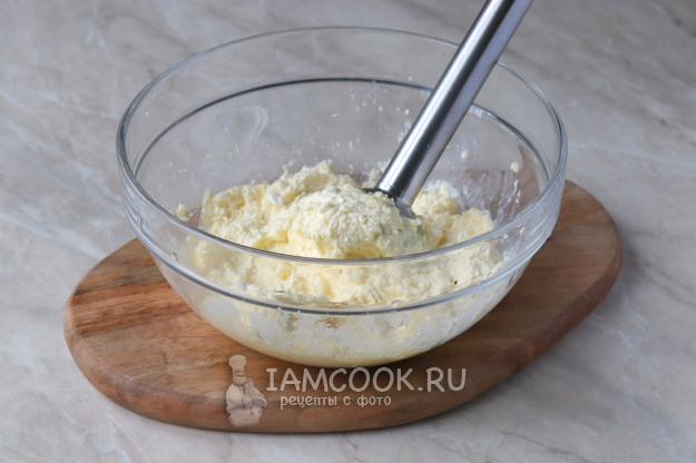 С помощью погружного блендера перебейте массу до однородного состояния. Также можно творог перетереть через мелкое сито, и только потом добавить нужные ингредиенты.