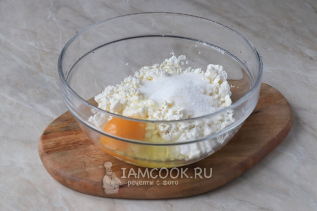 В глубокой миске соедините творог (у меня 9%), куриное яйцо и сахарный песок.