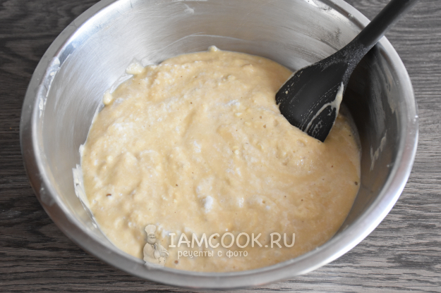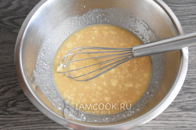Добавить муку, сахар, крахмал, разрыхлитель, соль и хорошо перемешать венчиком.