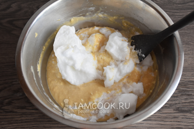 Аккуратными движениями снизу вверх ввести белки в тесто.
