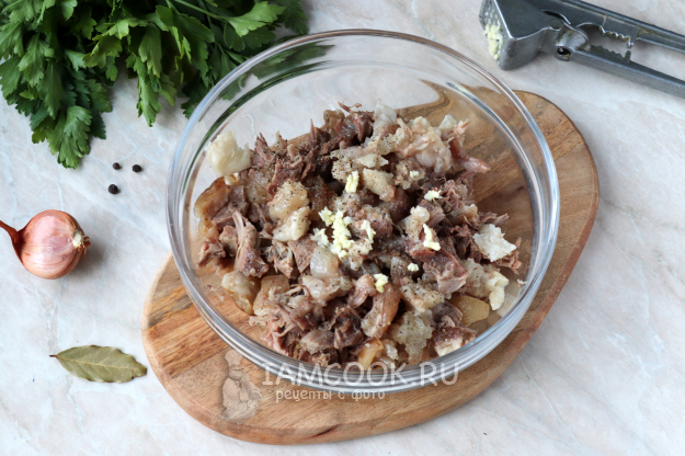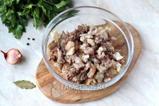 Затем достаньте рульку и дайте ей немного остыть, после чего удалите кость, а мякоть с салом нарежьте небольшими кубиками. Бульон процедите через слой марли или мелкое сито.