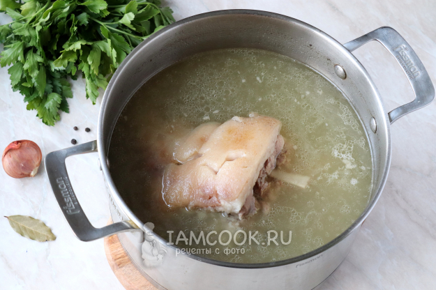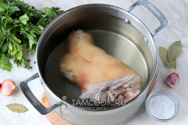 Свиную рульку тщательно промойте под холодной проточной водой и зачистите шкуру. Затем выложите в большую глубокую кастрюлю и залейте чистой фильтрованной водой в достаточном количестве (мясо должно быть полностью покрыто).