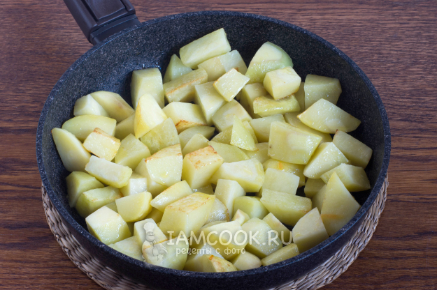 Картофель промойте, почистите, нарежьте кусочками чуть больше среднего и обжарьте на другой сковородке с добавлением 2 ст.л. растительного масла. Картофель должен чуть-чуть «схватиться».