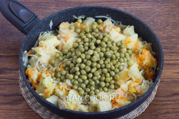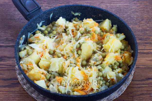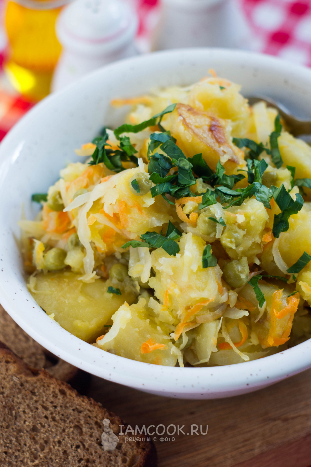 Тушеная картошка с капустой и зеленым горошком готова! Подавать блюдо лучше сразу же после приготовления.