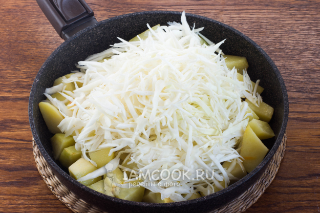 Капусту тонко нашинкуйте и добавьте к картофелю на сковородку.