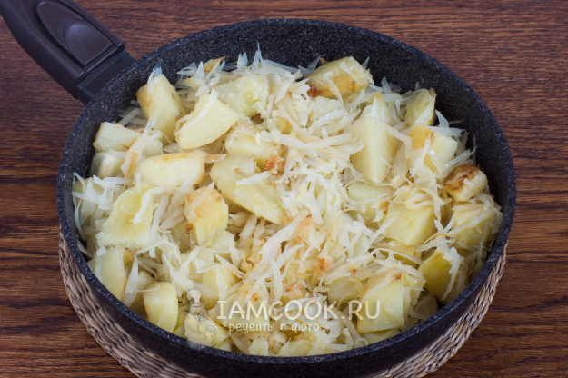 Перемешайте, накройте крышкой и тушите до мягкости капусты и готовности картофеля. Если овощи плотные и сухие, то влейте немного воды или овощного отвара.