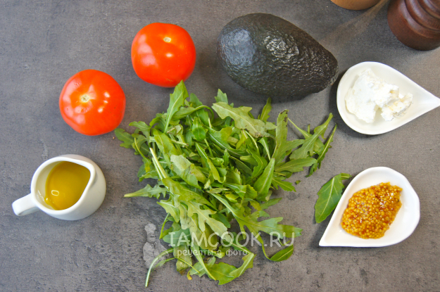 Подготовьте все нужные продукты для приготовления салата с рукколой, авокадо и помидорами.