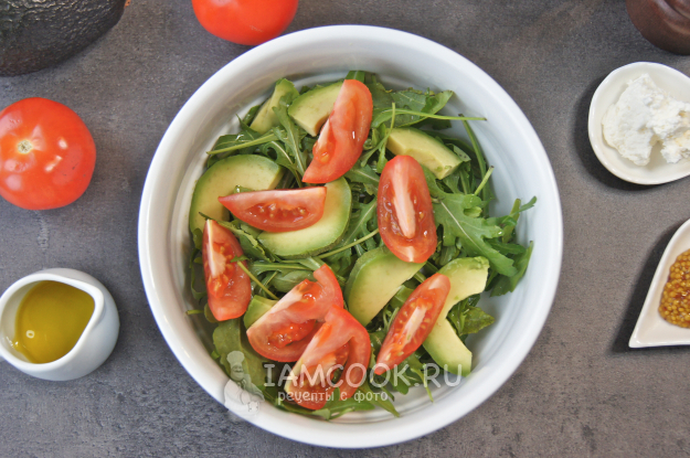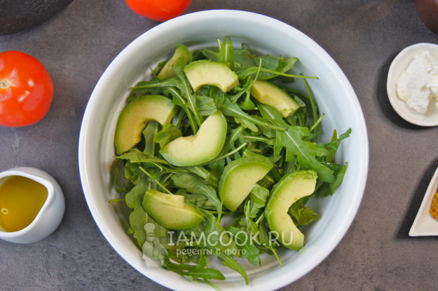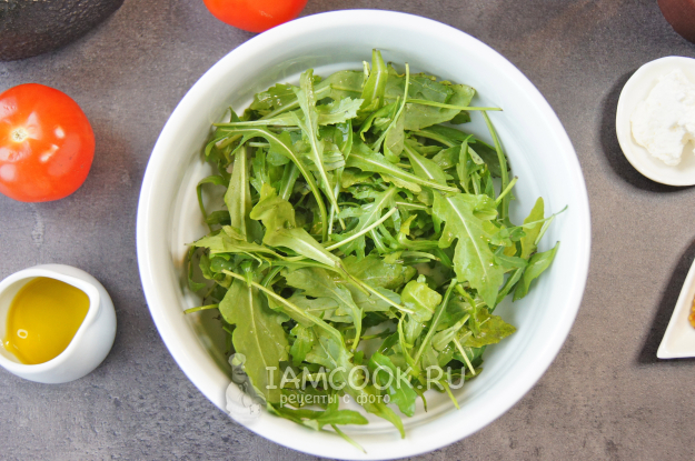 Рукколу промойте под проточной водой, обсушите и выложите в салатник.
