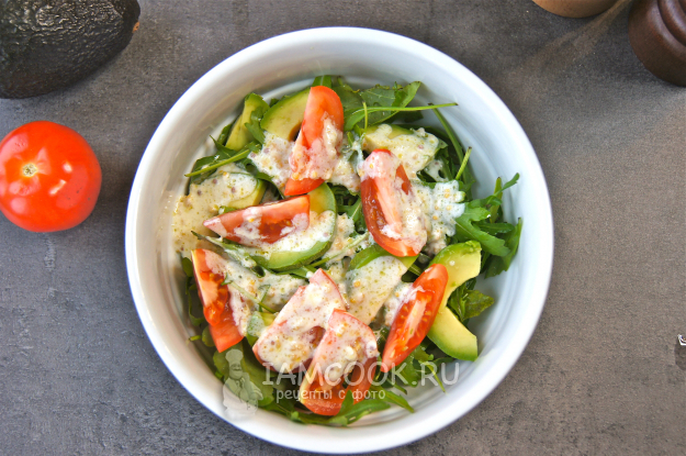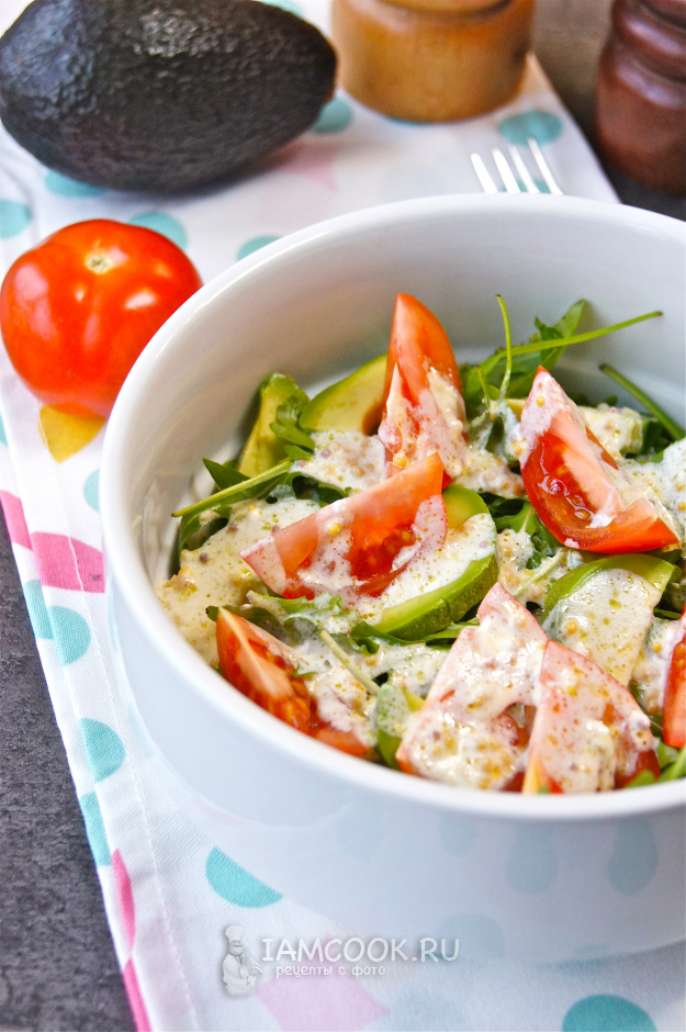 Вкусный, полезный салат с рукколой, авокадо и помидорами готов, можно подавать на стол.