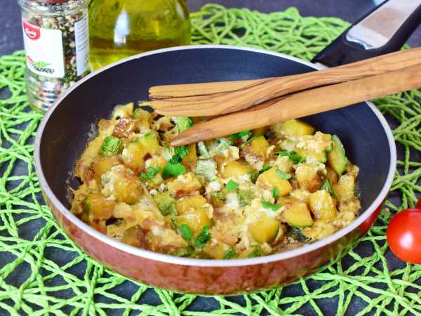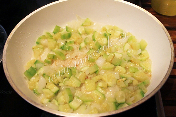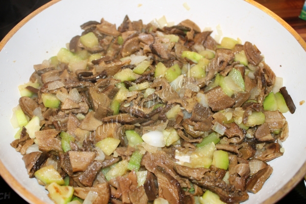 Грибы я залила водой и дала постоять. Кабачок, лук почистила, порезала на кубики и слегка обжарина на сковороде с небольшим количеством растительного масла.