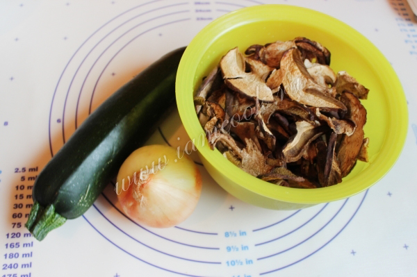 Итак я взяла - сушеные белые грибы, кабачок, головку репчатого лука, сметану и сливки.