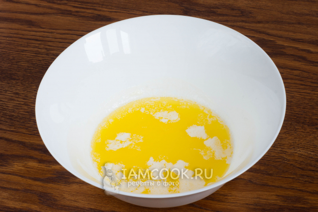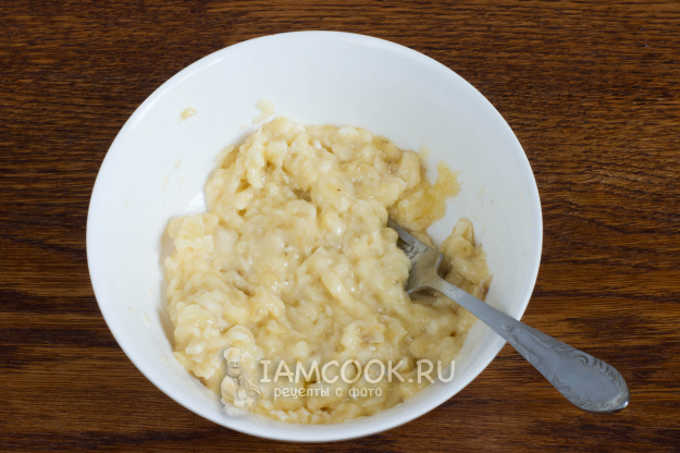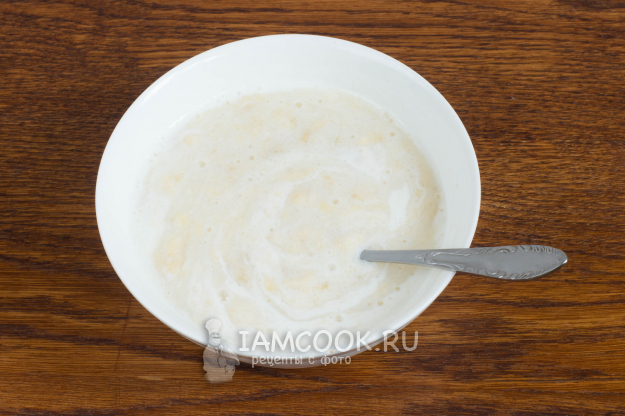 Добавьте к банановому пюре теплый кефир, щепотку соли и сахар. Перемешайте.