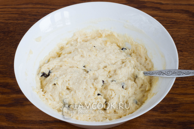 Влейте бананово-кефирную массу в сливочное масло и перемешайте. Муку перемешайте с разрыхлителем и добавьте в тесто, размешайте. Добавьте вяленую вишню (крупные ягодки можно разрезать пополам). Перемешайте тесто до однородного состояния.