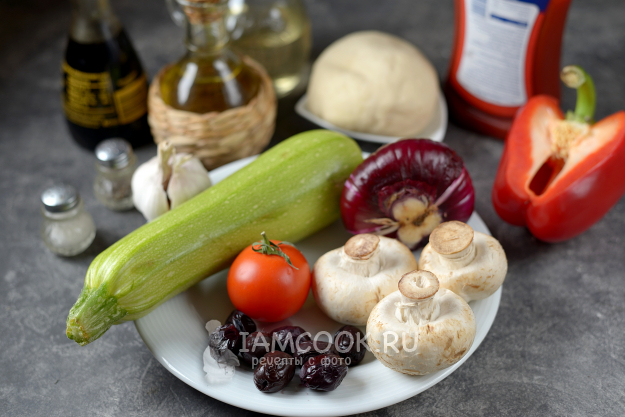 Подготовьте все необходимые продукты для веганской пиццы. Овощи помойте, обсушите насухо бумажными полотенцами. Тесто у меня классическое: мука, вода, дрожжи, соль.