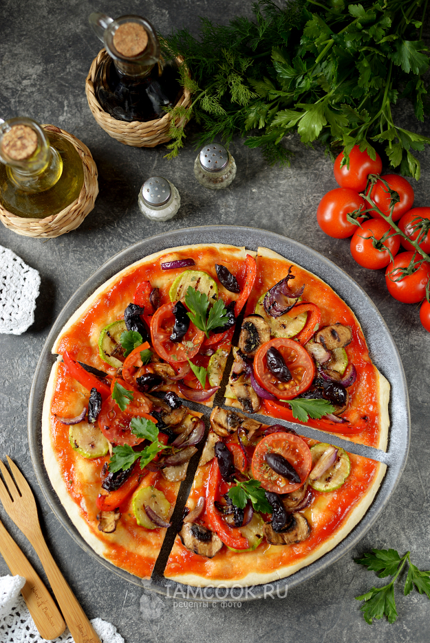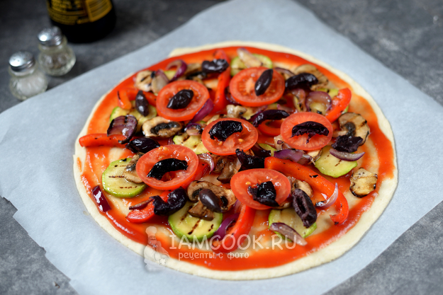 Сверху положите тонкие ломти помидора для большей сочности и очищенные от косточек маслины. Отправьте в предварительно разогретую до 250 градусов духовку на 7-10 минут, смотрите по своей духовке.