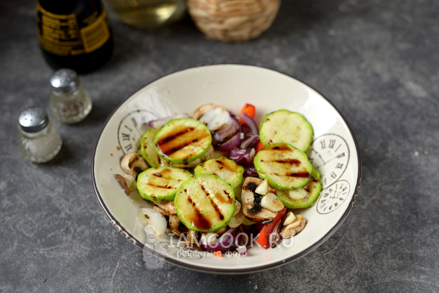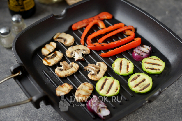 Очистите болгарский перец от семян и плодоножки, очистите лук. Нарежьте все свежие овощи тонкими ломтиками, обжарьте на сковороде-гриль с обеих сторон до легких подпалин.